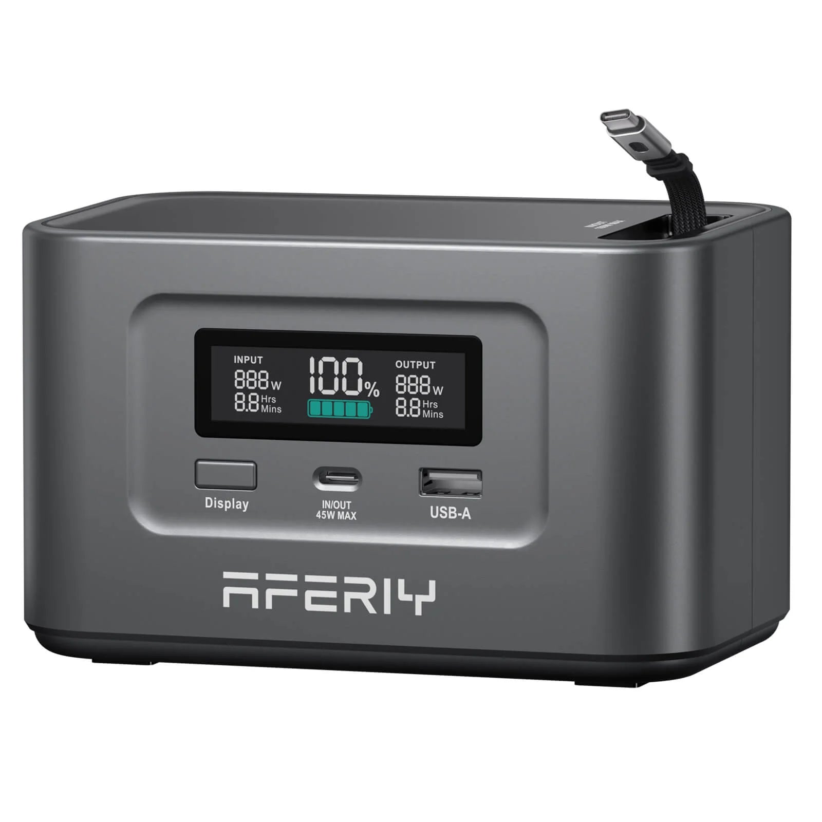 AFERIY Nano100 LiFePO4 100W Power Bank features two 145W USB-C ports (100W + 45W, input/output) and one USB-A port. It can quickly charge multiple devices simultaneously: smartphones, tablets, headphones, drones, Nintendo Switch, etc.