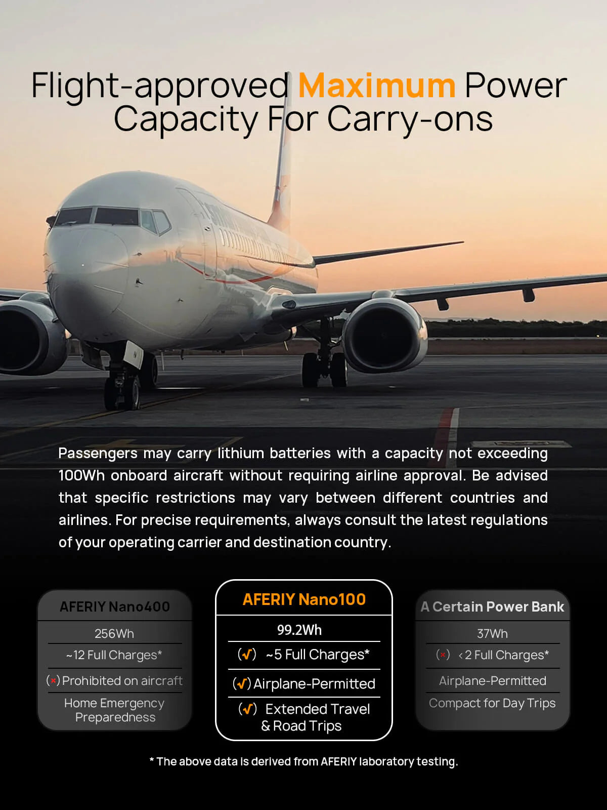 The AFERIY Nano100 100W portable power station features NTC technology and 6-in-1 protection to prevent overvoltage, overcharging, overheating, short circuit, and more. Intelligent thermal protection ensures a long-lasting LiFePO4 battery, making it ideal for travel or flights.