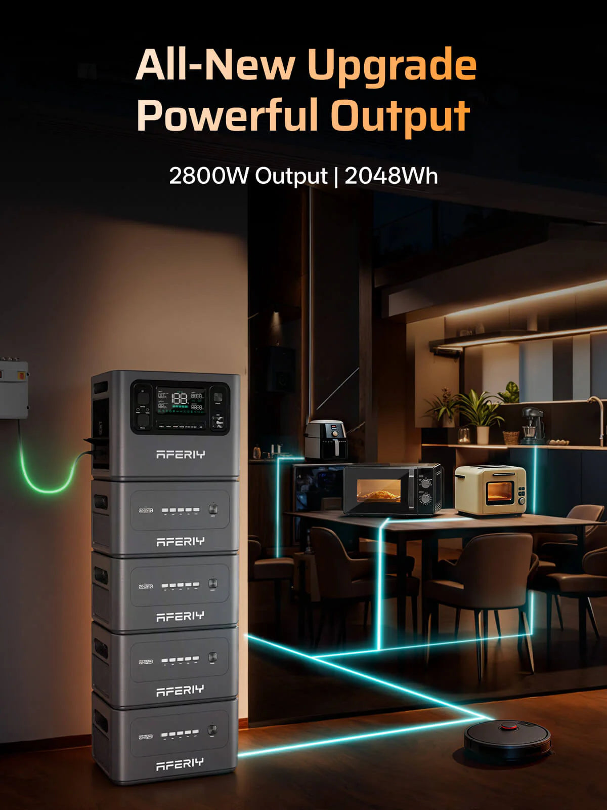 Experience reliable, eco-friendly power with the AFERIY AF-P280. Delivering up to 2800W output with a 2048Wh base capacity, this LiFePO4 power station is built to power your home, work, and adventures anywhere.