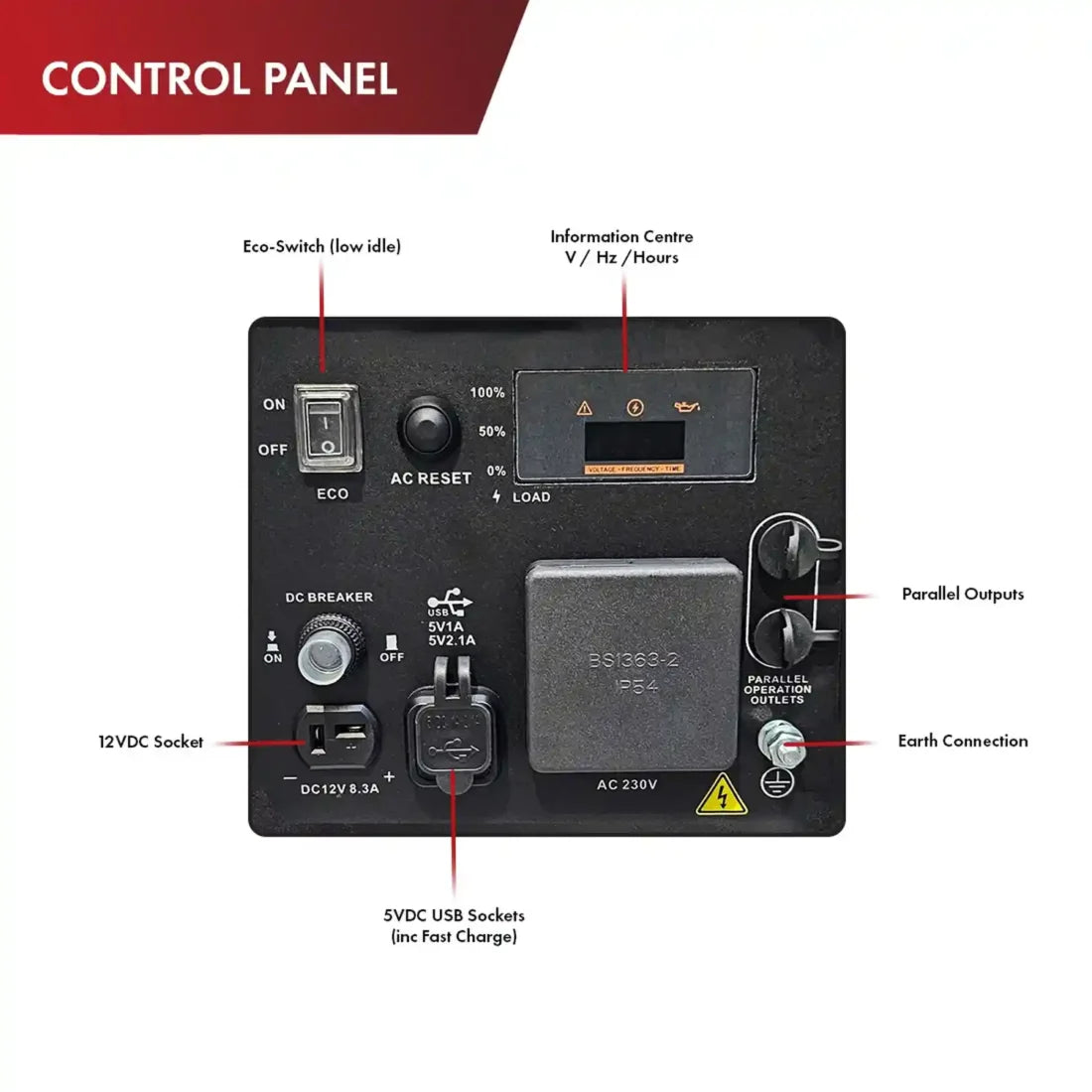 The Excel Power XL2250iS is equipped with a variety of power outlets to suit your needs. It features one 13A 240V UK 3-pin socket and one 12V DC socket, providing versatile options for powering your tools and devices. Additionally, the generator includes a parallel port, allowing you to couple another unit for increased power output. This feature is particularly useful for situations where additional power is required, giving you the flexibility to expand your power capabilities as needed.