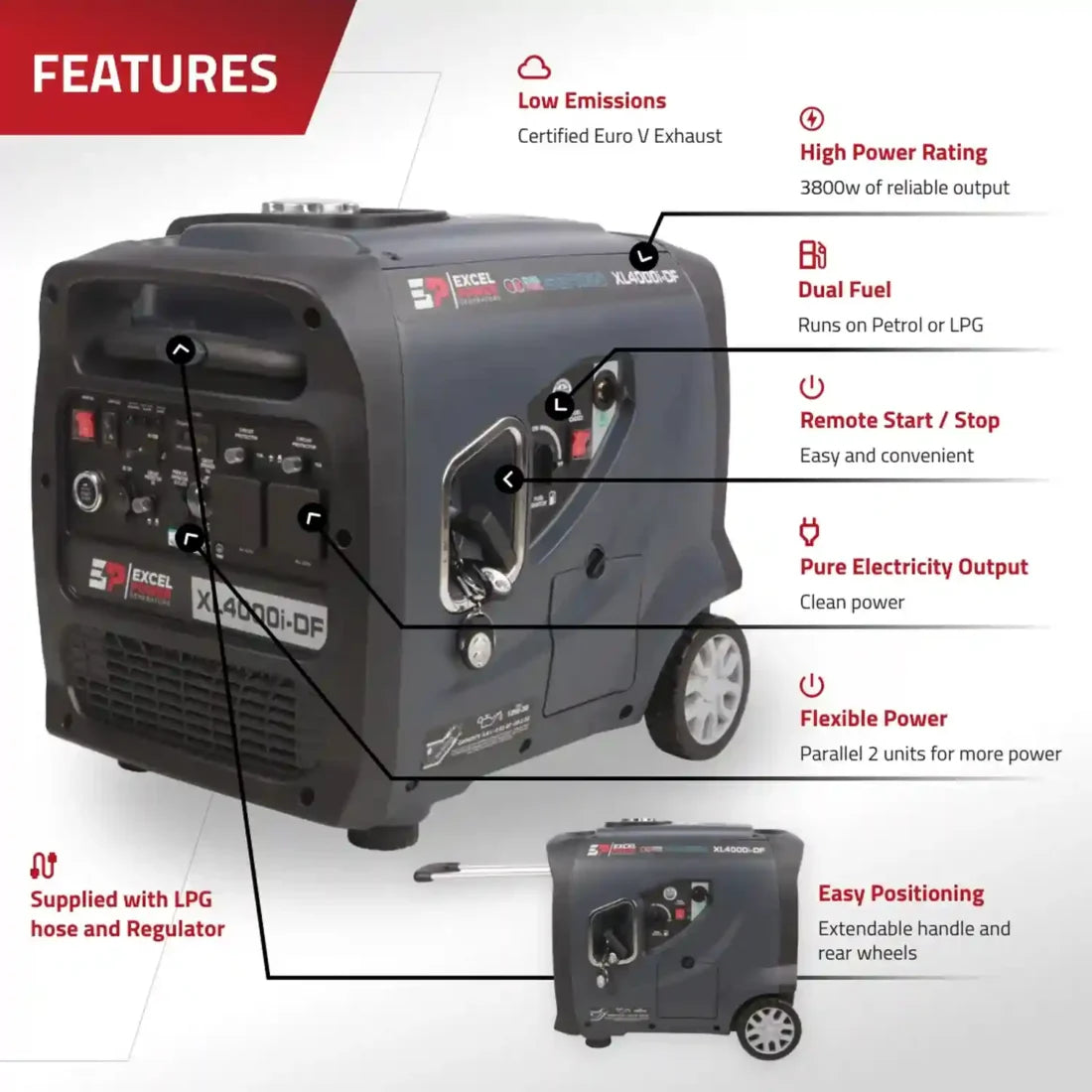 Following on from the success of the Excel Power XL4000i and the Mark II XL4000ii generator, Excel Power Generator listened to what the market needed and developed the XL4000i-DF Dual-Fuel version. This has the same feature-packed specification as the XL4000ii but with an integrated LPG system so it can be powered by either fuel.