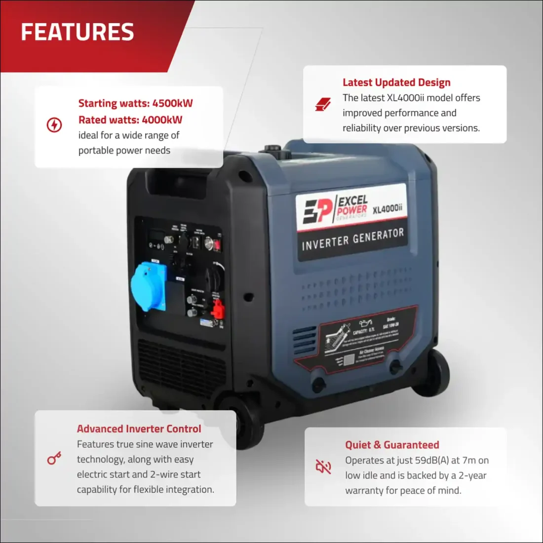 The Excel Power XL4000ii petrol inverter generator is the updated and upgraded version of the best-selling XL4000i – now it has electric start, remote key fob start/stop, automatic choke, remote 2-wire start and an improved looking tough external case.