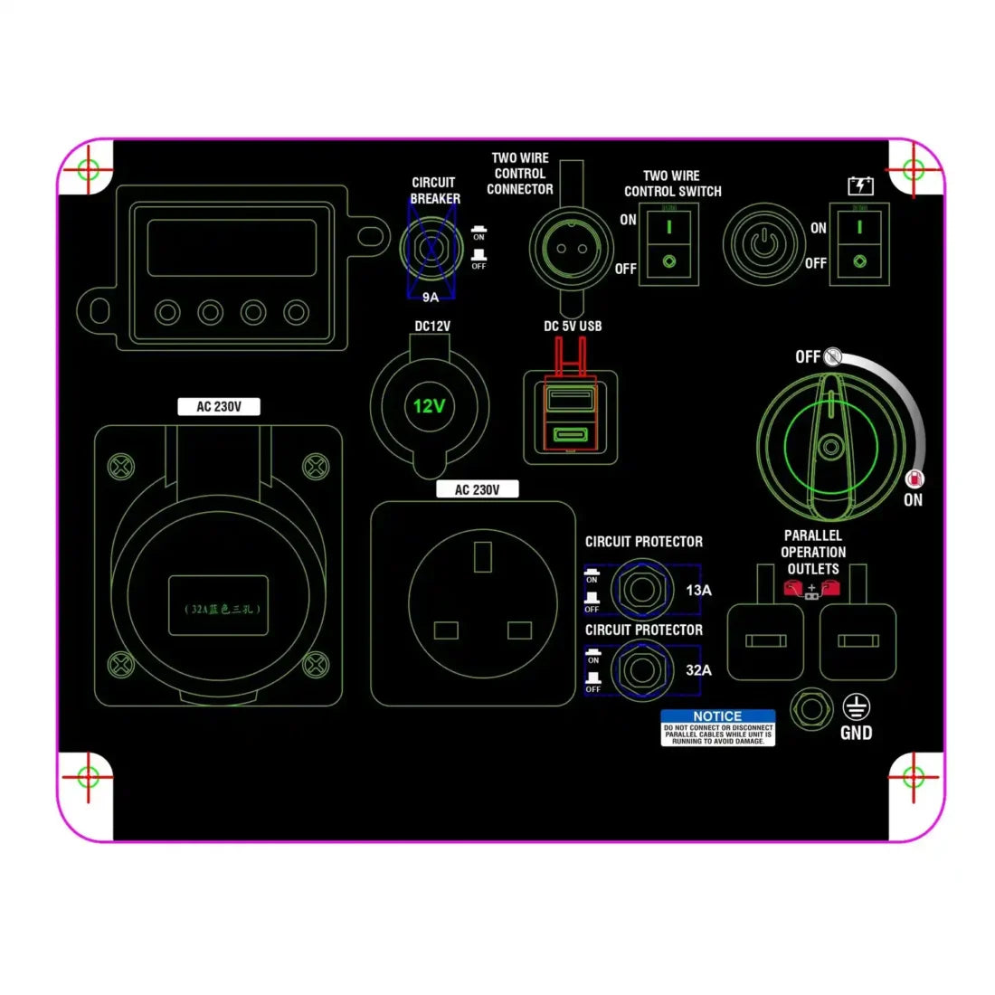 The XL4000ii has one UK standard 3 pin sockets which means no adapters are required and one 32A 240V (Blue socket) – this generator was designed in the UK for use in the UK!
