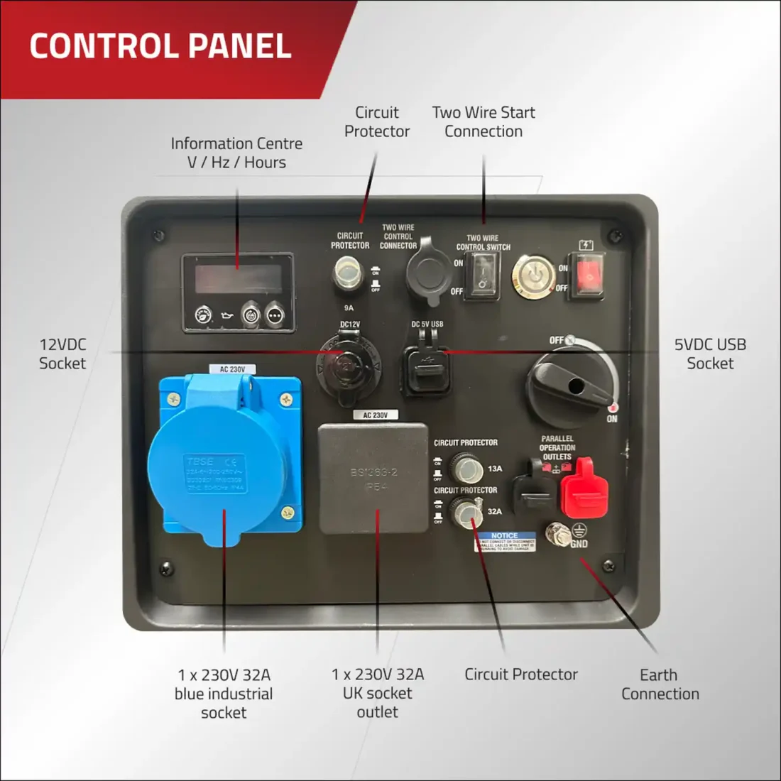 • Full dashboard with digital read-out for engine hours, voltage and frequency – you can keep an eye on voltage, frequency and hours run.