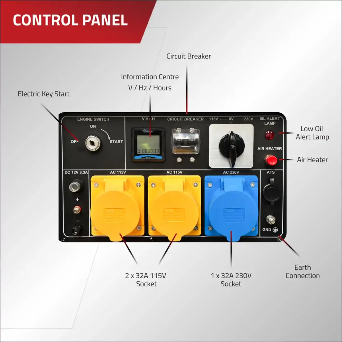 There are 1 x 32A 230V socket, 2 x 32A 110V, and 1 X 12V DC port to connect your electrical equipment up to. Also, this unit has as an easy-to-read onboard digital display so you can see information such as, hours run, output voltage and frequency. The hour’s run meter is important as you will need to know when your generator will need servicing after the scheduled hours run time has been reached. This will keep your generator maintained and running for thousands of hours use.