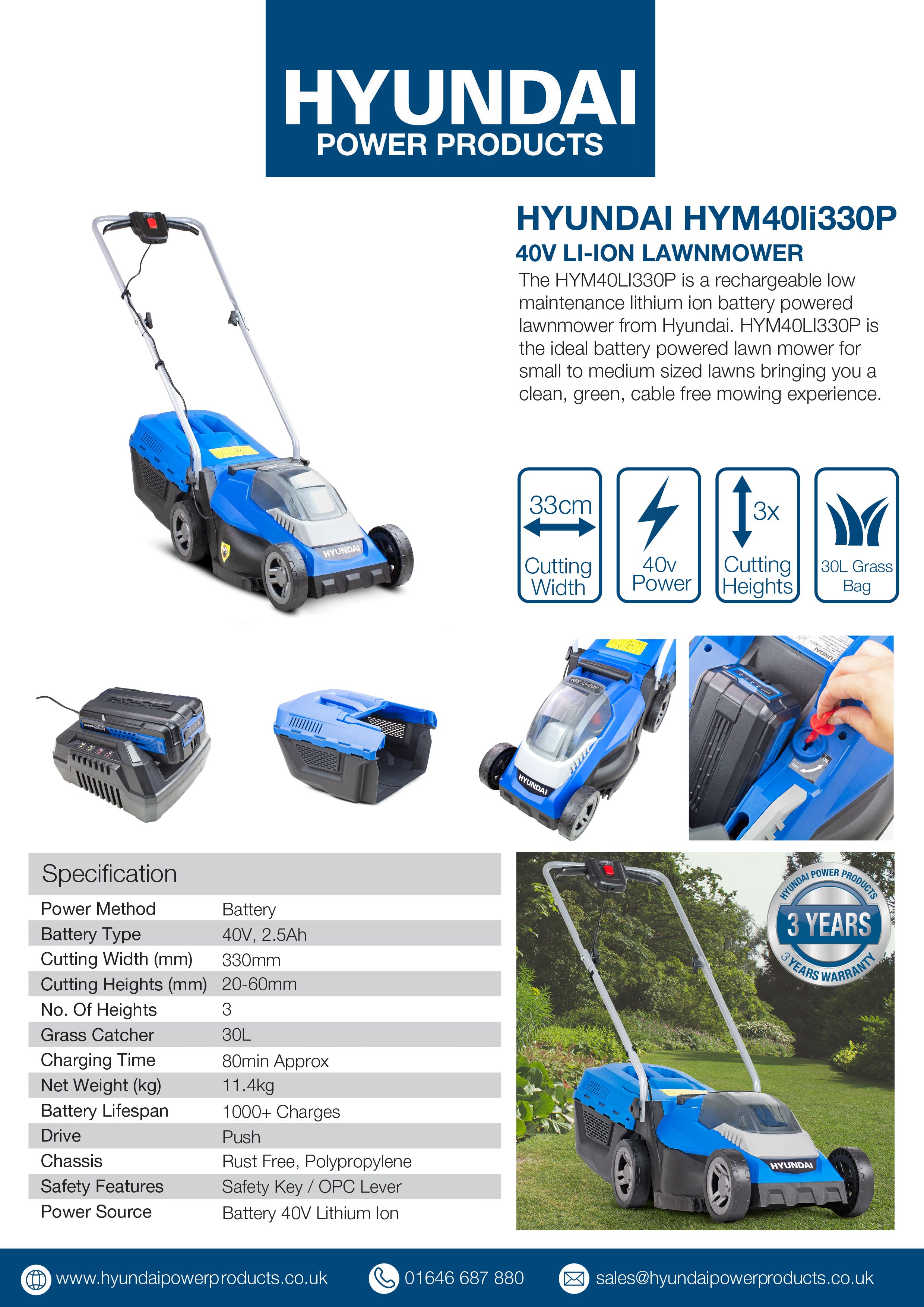 The HYM40LI330P mower features a powerful 40v motor and comes complete with a 40v battery and charger. The battery also has a handy indicator light allowing you to see exactly how much battery life is remaining.