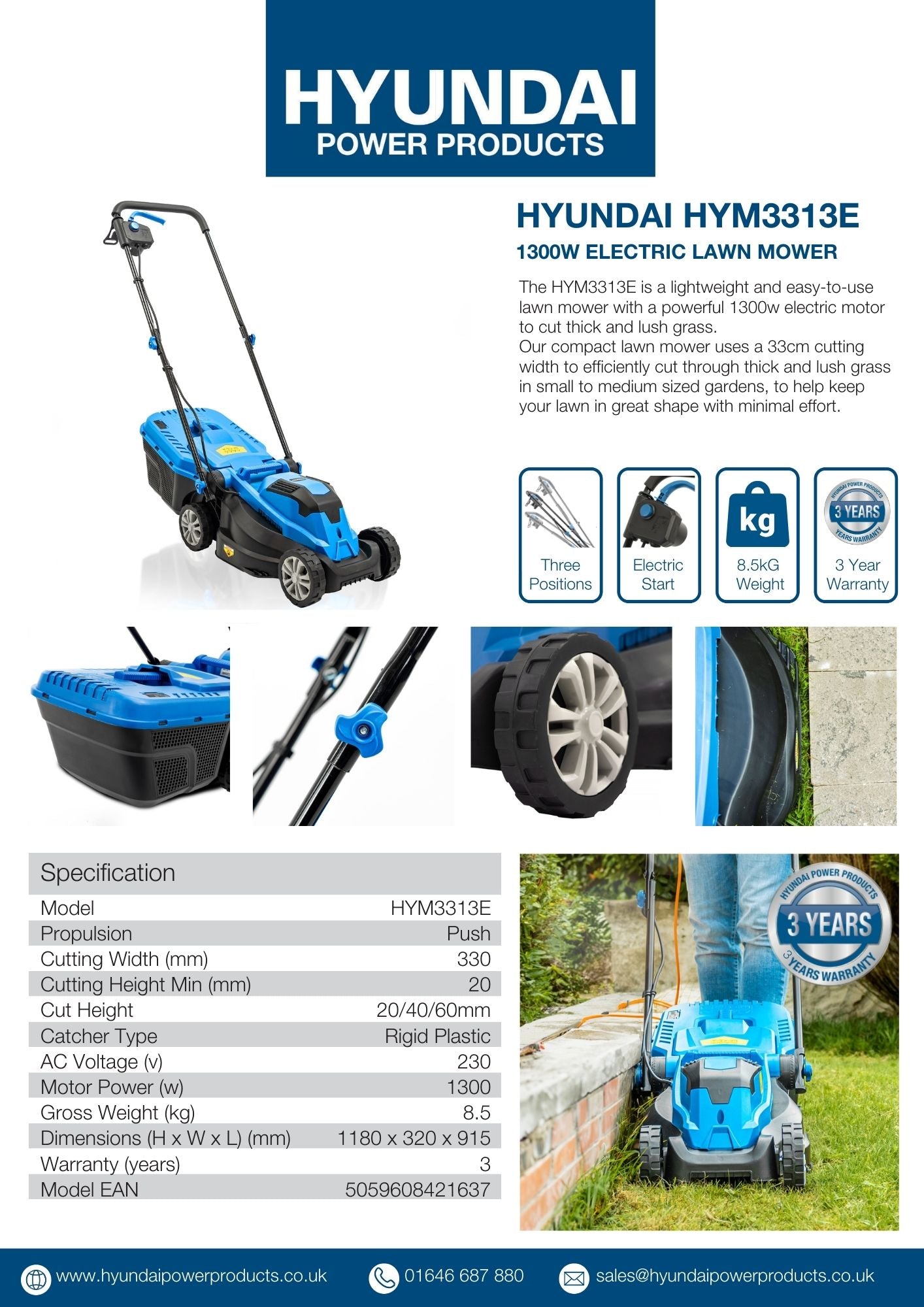 The HYM3313E is a lightweight and easy-to-use lawn mower with a powerful 1300w electric motor to cut thick and lush grass.