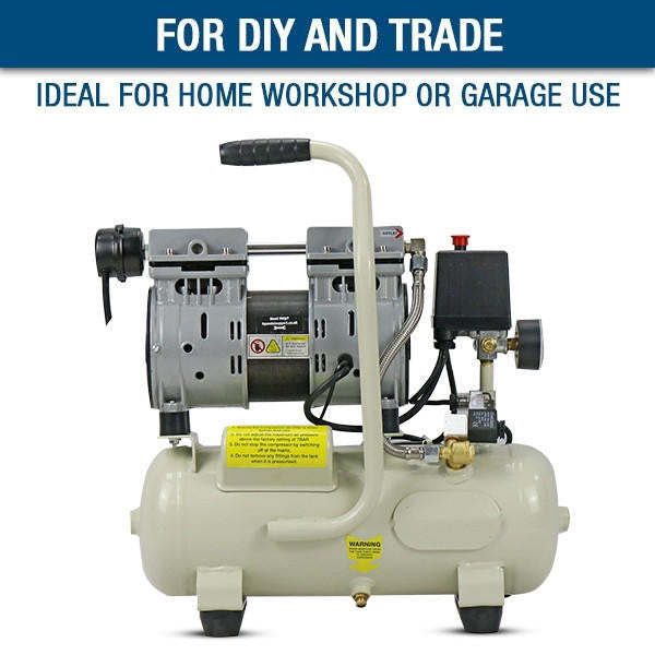 With an 8-litre tank capacity, this near silent compressor provides an air displacement of 4CFM/ 120 litres per minute and a discharge pressure of 7 bar/ 100 psi.