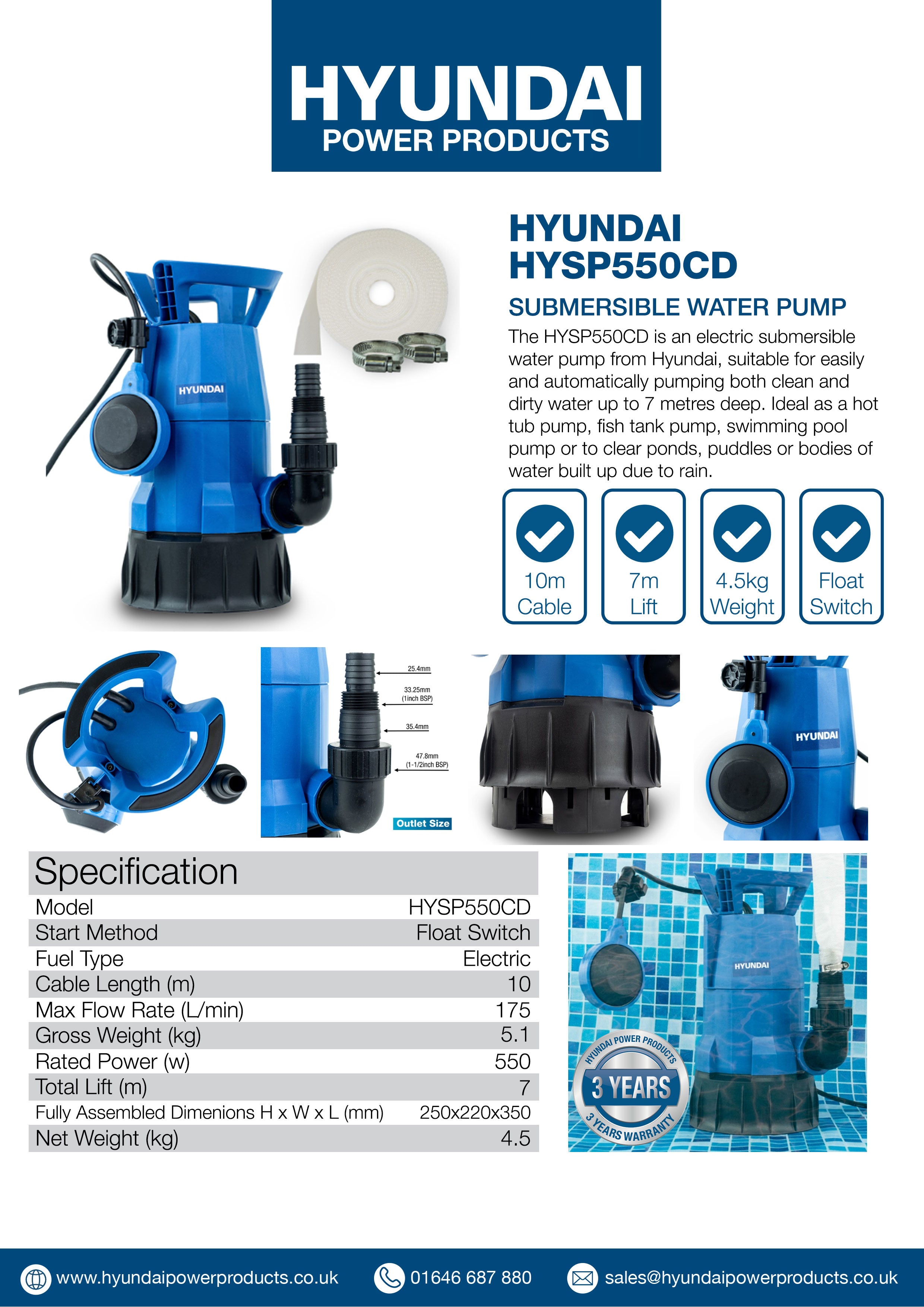 With a maximum submersion depth / head of 7 metres (23 feet), the HYSP550CD has an automatic float switch to start and stop the pump whenever water is over or under a certain level to prevent any damage to the pump. This also means you can leave the pump switched on to drain large bodies of clean and dirty water and it will automatically switch off when the water level is less than 5cm deep and switch back on when the water level is above 50cm deep.