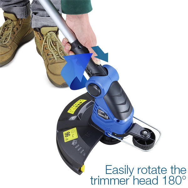 The 290mm/11.4” cutting width on this garden trimmer ensures grass and weeds are trimmed quickly and efficiently. The trimming head swivels 180 degrees to become a lawn edge trimmer, using the edging wheel to achieve a perfect, neat, and tidy finish on your garden.