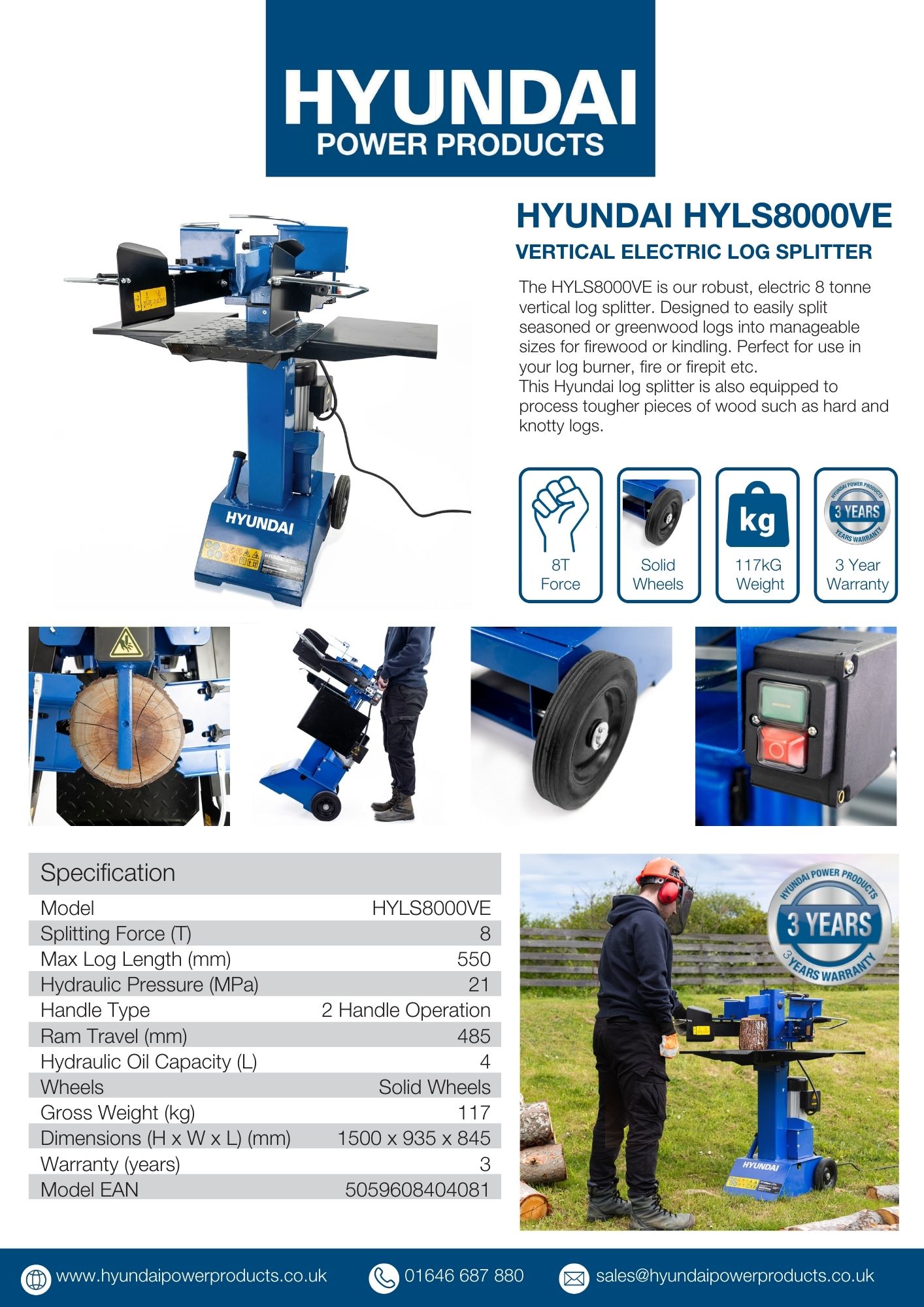 The Hyundai HYLS8000VE is a powerful 8 tonne vertical electric log splitter designed for homeowners who need fast, safe, and reliable firewood preparation.