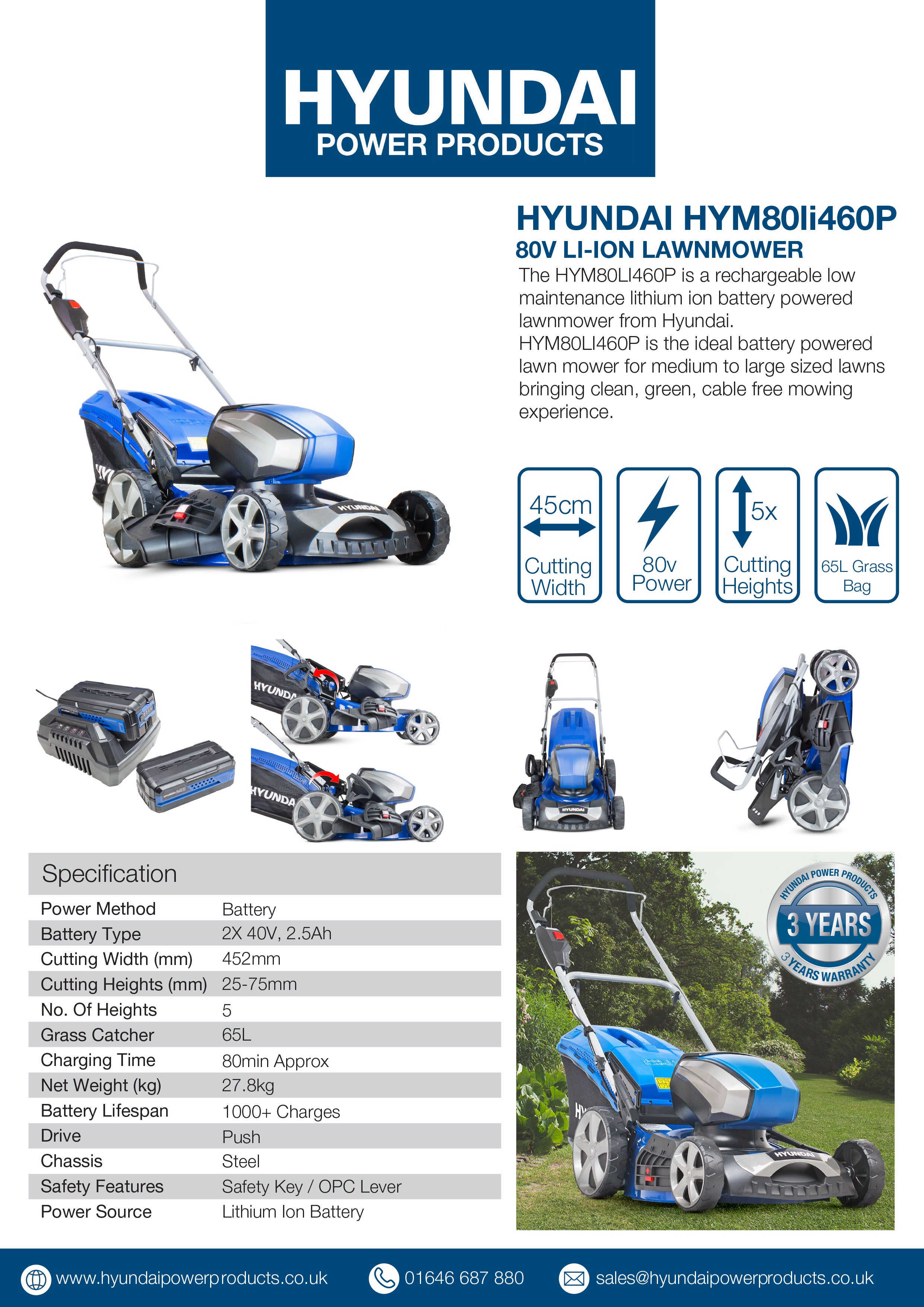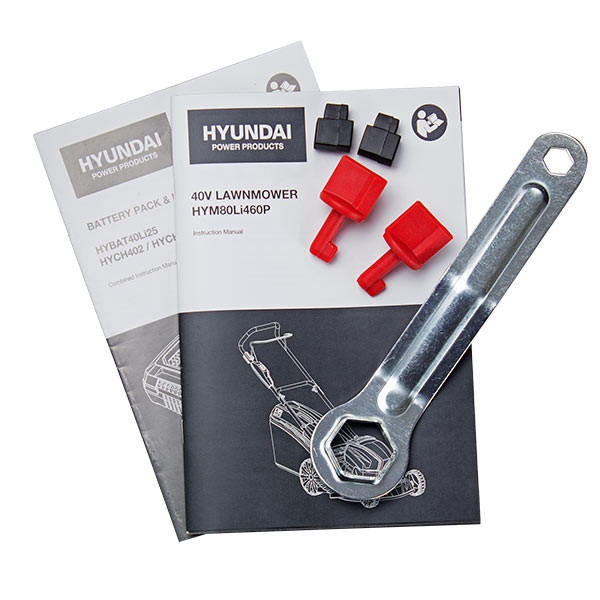 | In The Box | HYM80LI460P Battery Powered Lawnmower 65L Hard Top Grass Collector 2 x.2.5ah 40v Rechargeable Lithium-Ion Battery Battery Charger 2 x Safety Keys User Manual |