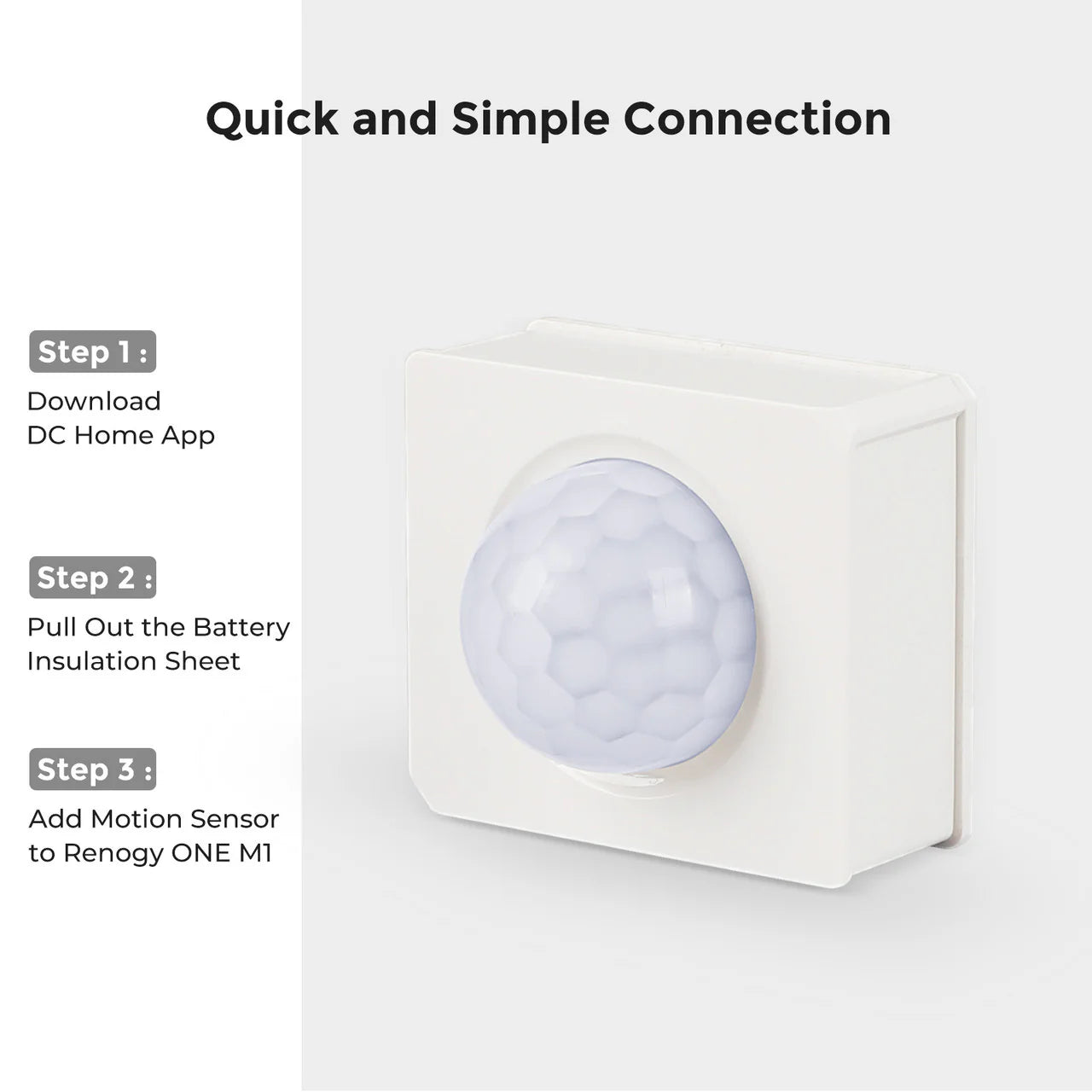 The RENOGY Motion Sensor based on Zigbee 3.0 detects movements with a distance up to 19.69ft and angle up to 110°. It has an ultra-long usage time with a lithium coin battery embedded. You can get multi-scene linkage with other accessories by setting up a unique smart scene via Renogy ONE M1 on your DC Home app.